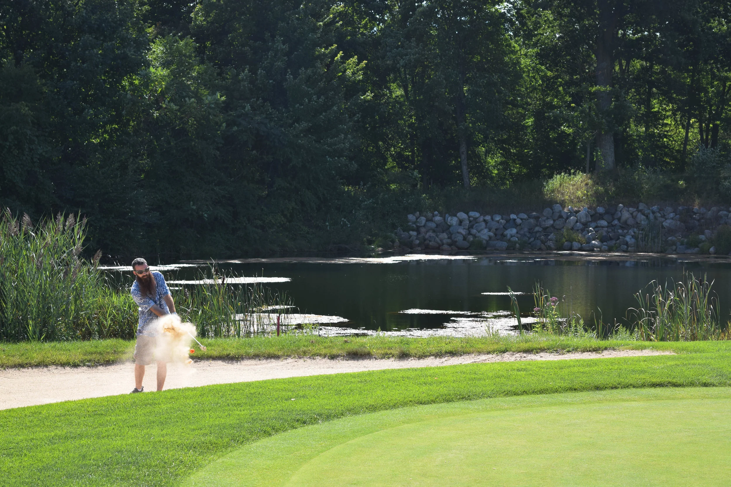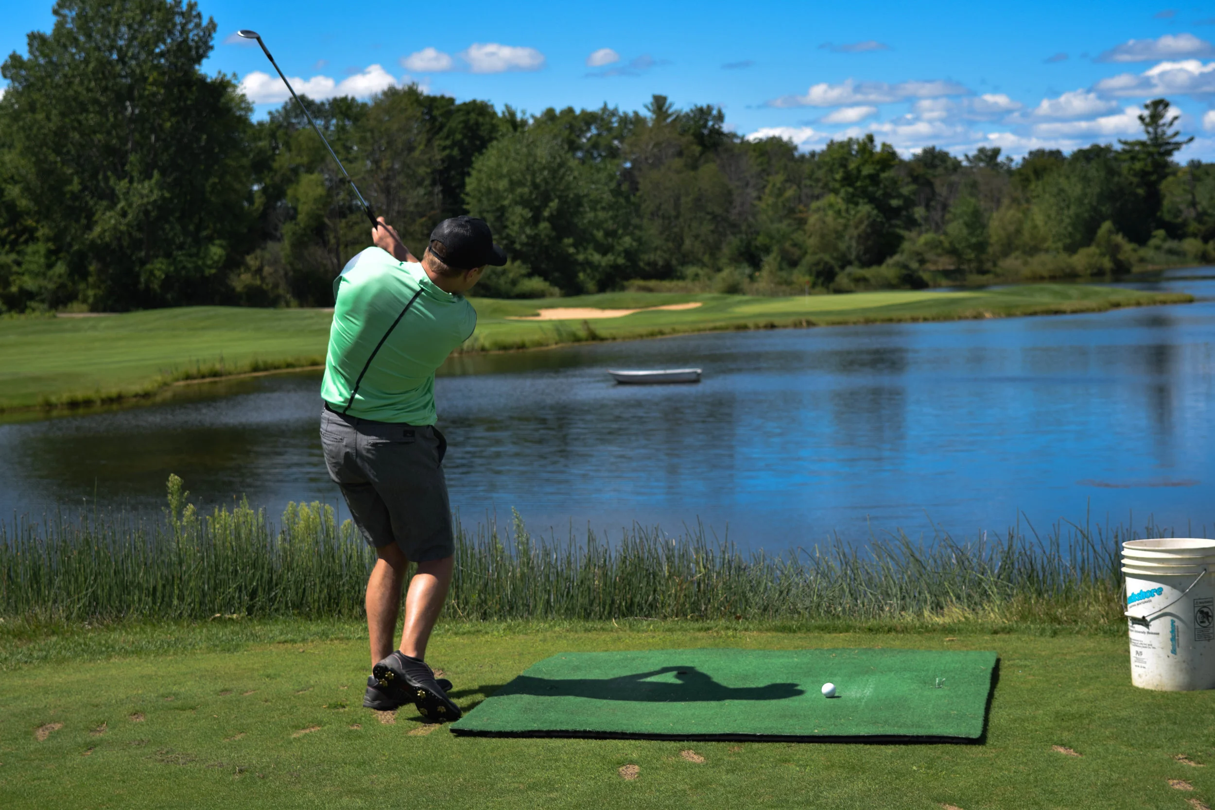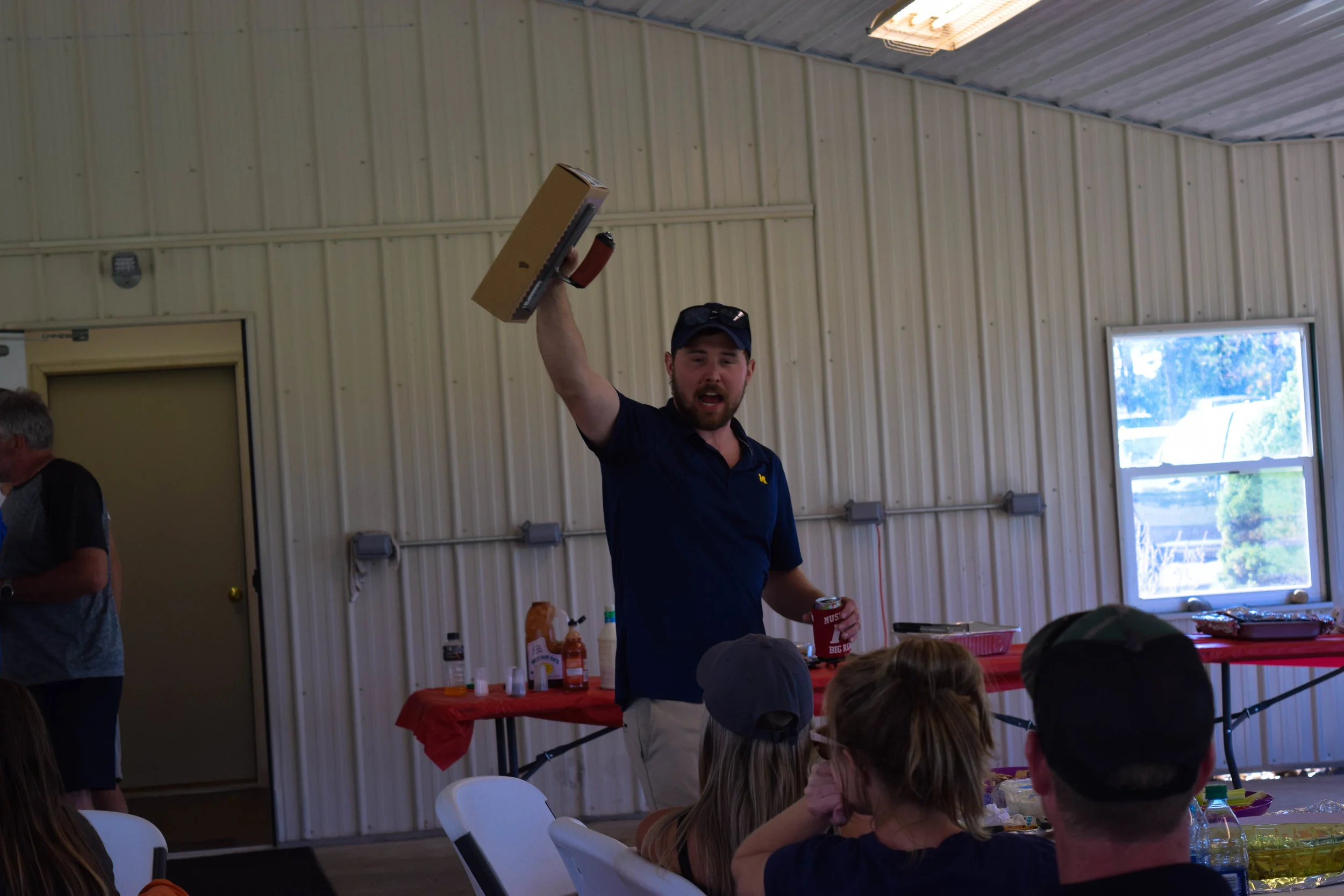The first item on the agenda was an old favorite, the “Hit the Boat” contest. Each guest got three chances to hit a boat about 100 yards out in the middle of the pond with a golf ball. Many stepped up to the green, but only one hit the boat: the brother of one of our installers, Ryan.